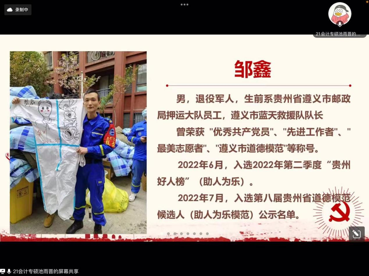 会计学院研究生第三党支部书记曹斌说明了此次活动的重要意义,她要求党员同志们在此疫情的特殊时期,要向优秀党员学习,提升自己的综合素质和奉献意识,积极投身到学校和所在社区的疫情防控工作中去,贡献自己的一份力量。