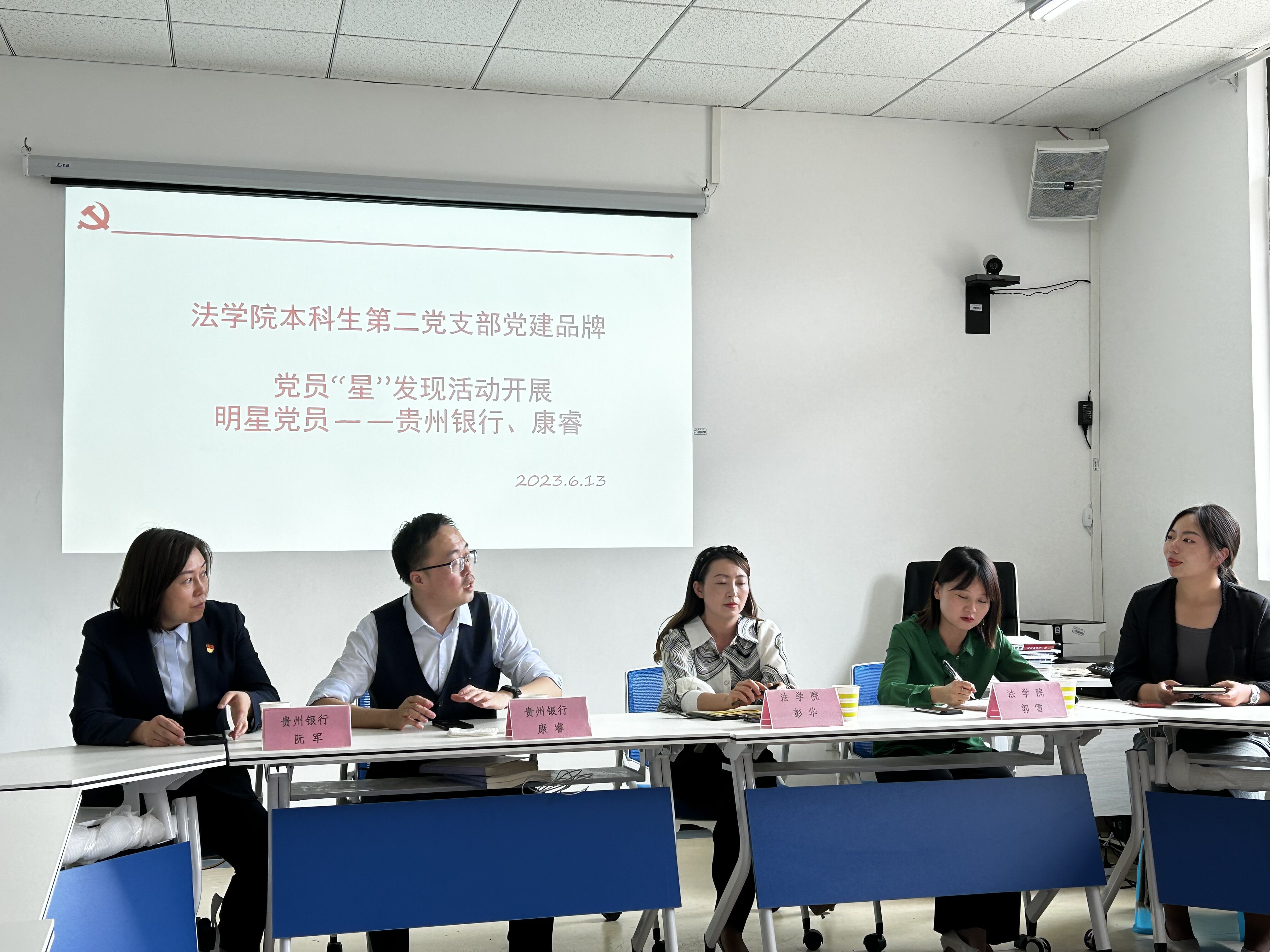 为落实学习贯彻米兰网址新时代中国特色社会主义思想主题教育相关要求,切实提升在校大学生金融素养,倡导学生树立正确的价值观和消费观,2023年6月13日下午,法学院本科生第二党支部联合贵州银行总行机关第九党支部共同开展了“金融普法、护航青春”主题党日活动。