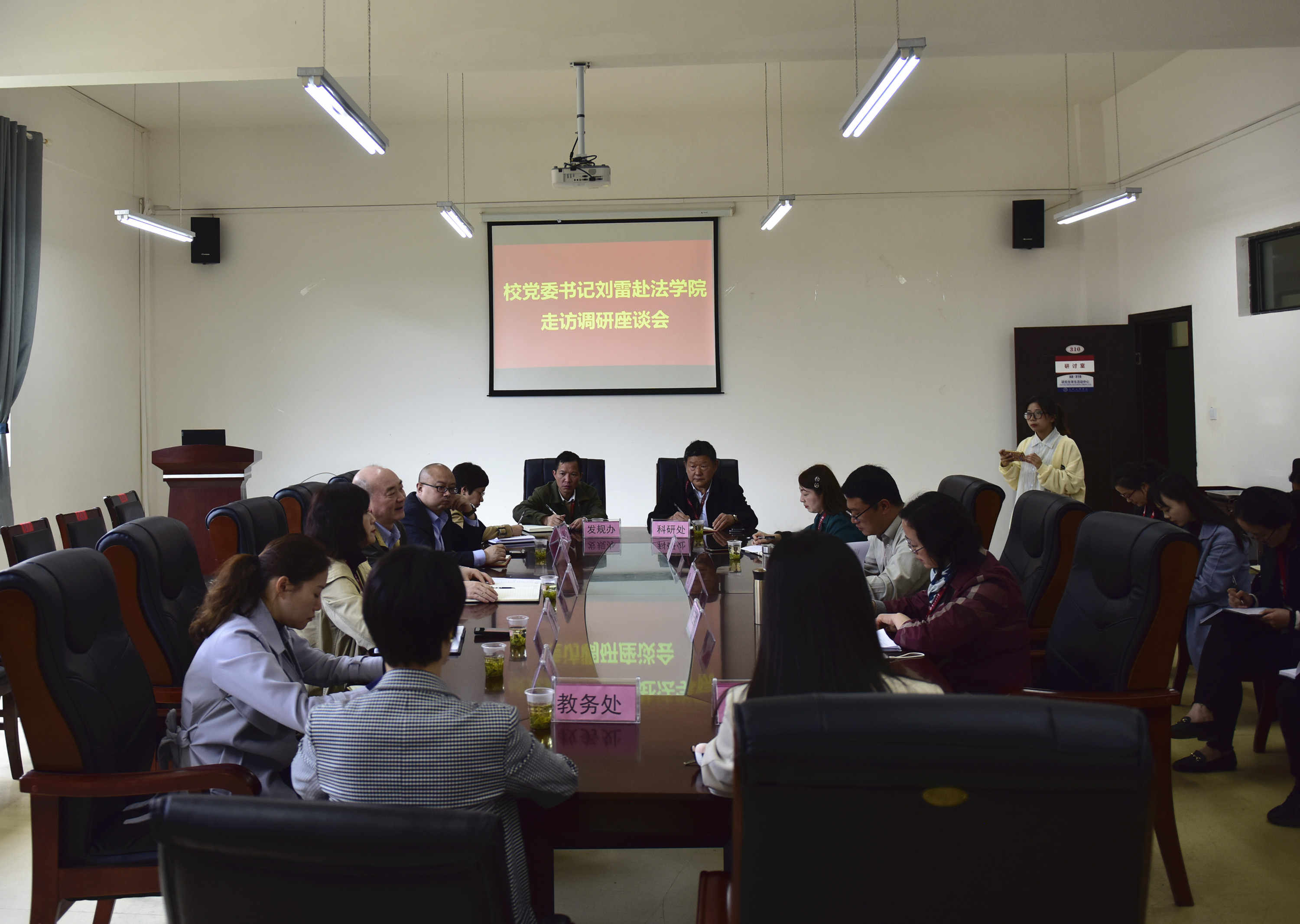 4月20日下午,校党委书记刘雷带领党政办公室、党委组织部、党委宣传部、人事处、发展规划与学科建设办公室、教务处、科研处和国有资产管理处等相关职能部门负责人到法学院走访调研,了解学院重新组建后的情况及面临的机遇与困难。法学院党委书记詹伟,副院长(正处级、主持工作)陈玉梅,党委副书记彭华,以及全部行政人员、教师代表参加调研座谈会。