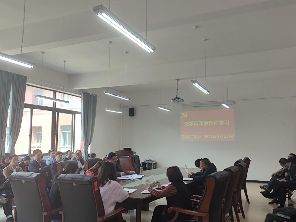 (图丨陆小燕 文丨金方雨)2021年4月27日下午,法学院党委在文德楼A8-310会议室组织召开“深刻铭记中国共产党百年奋斗的光辉历程”政治理论学习集体研讨会议。院领导及全院教职工出席会议,院党委书记詹伟主持会议。