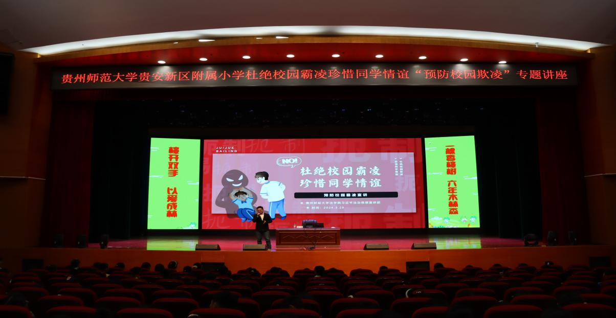 为了加强未成年人权益保护,提高未成年人法治素养,近日,米兰登录入口米兰网址法治思想宣讲团(杨勇老师带队)应邀为贵州师范大学贵安附属小学学生开展了“杜绝校园霸凌 珍惜同学情谊”主题宣讲活动。本次活动由杨勇老师带队,张凯嘉、代申萍等六名宣讲团成员参与,贵州师范大学贵安附属小学四至六年级全体同学及部分教师数百人参加。