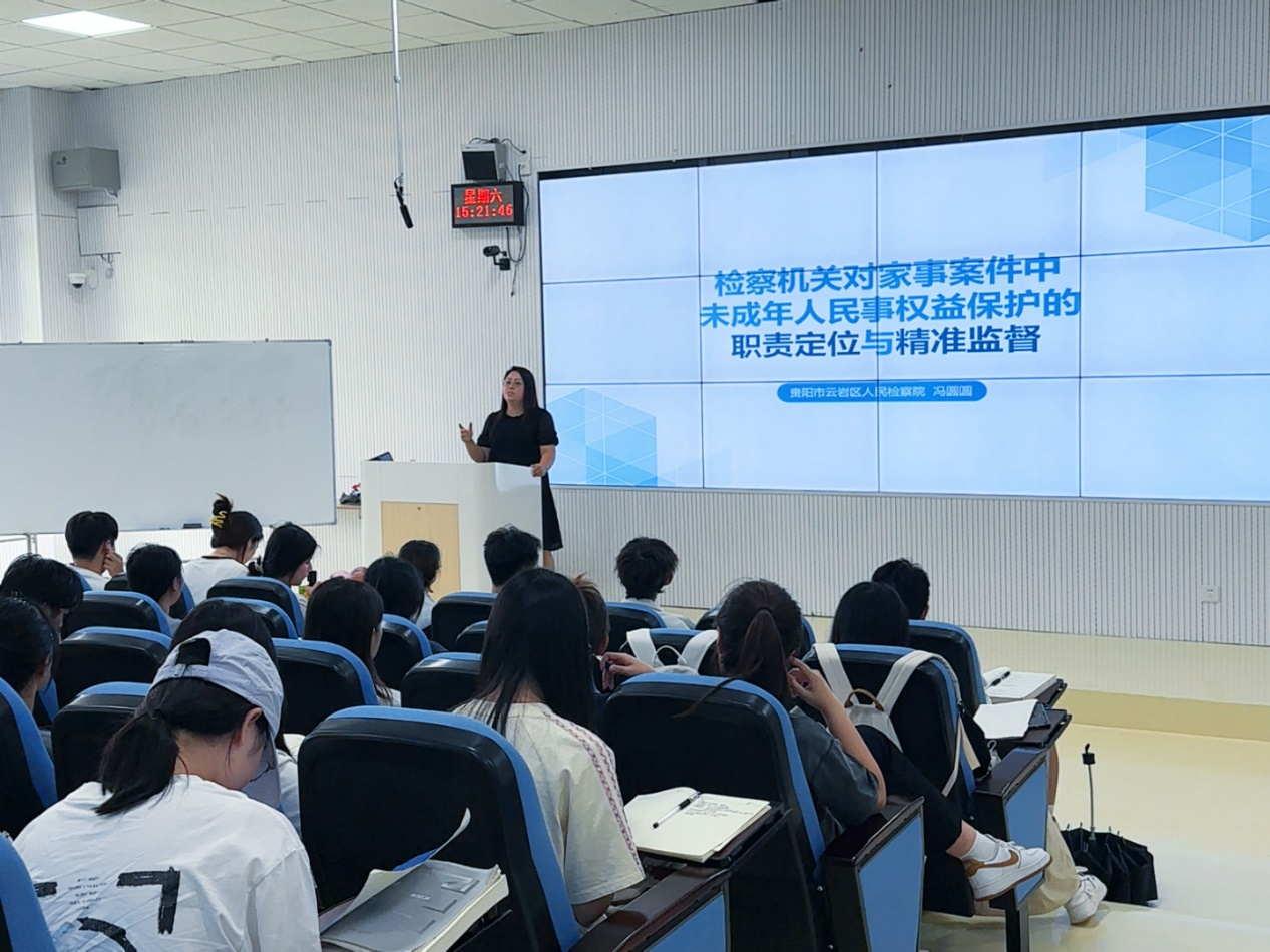 (法学院 王紫微 刘媛 图文报道)9月9日下午,milan体育“三大论坛”之人文论坛、贵州省人民检察院“检察实务专家进校园”系列课程第二讲在乐学楼成功举办。本次讲座特邀贵阳市云岩区人民检察院检委会专职委员、一级检察官冯圆圆,以“检察机关对家事案件中未成年人民事权益保护的职责定位与精准监督”为主题进行授课,法学院副院长宋昭澜主持讲座,百余名师生到场聆听、交流。