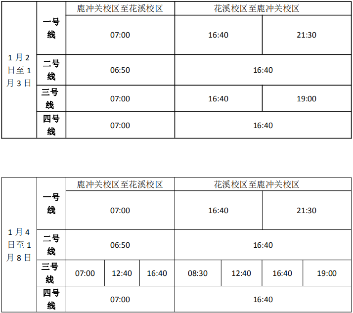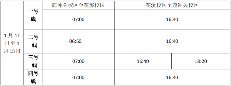 按照学校统一安排,milan体育鹿冲关校区、花溪校区进入期末考试阶段, 1月8日考试结束,为满足期末考试需要和行政科研工作的开展,现对交通车作如下调整: