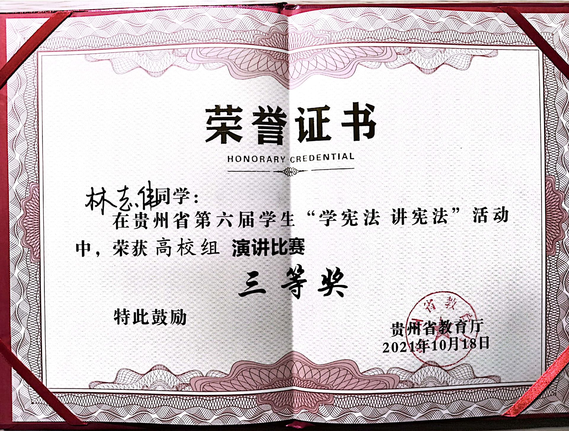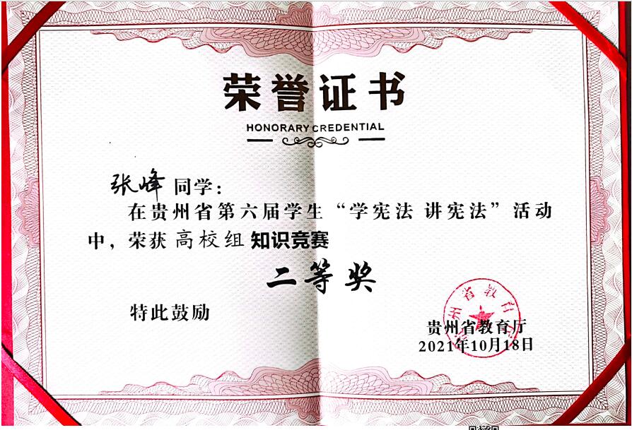 10月18日,由省教育工委、省教育厅主办,贵州民族大学承办的全省第六届学生“学宪法 讲宪法”活动总决赛在贵州民族大学举行,milan体育法学院学子张峰、林志伟经过多轮激烈比拼后,晋级总决赛,同来自全省各高校的参赛选手进行角逐。最终张峰同学荣获知识竞赛二等奖,林志伟同学荣获演讲比赛三等奖。